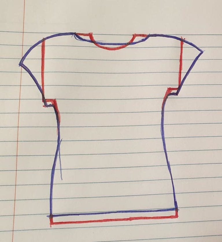Time for the stiffer fabric…. I made the neck hole narrower (between the shoulders) but deeper (at the front) so I could still get it over my head. I also squared up the kimono sleeves so I could turn and hem them more easily. The new shape is in red below.