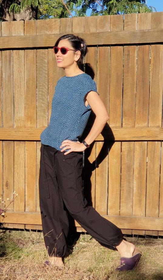At a hefty $30/m, even I was going to make a toile – especially when the pattern only had 2 pieces. It doesn’t get any simpler than that: one front piece, one back piece. So I dug into my stash for a spotted and soft double guaze from Spotlight to use as the toile. There was barely enough fabric and I loved that – not much wastage and some stash-busting to boot. It’s worth noting that unless you have over 140cm fabric width, you’re going to need cut the pieces one above the other, which means having a long length of fabric leftover down the side. Might work for pants later.