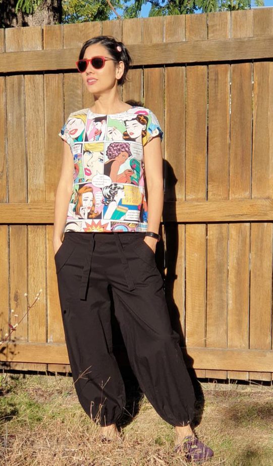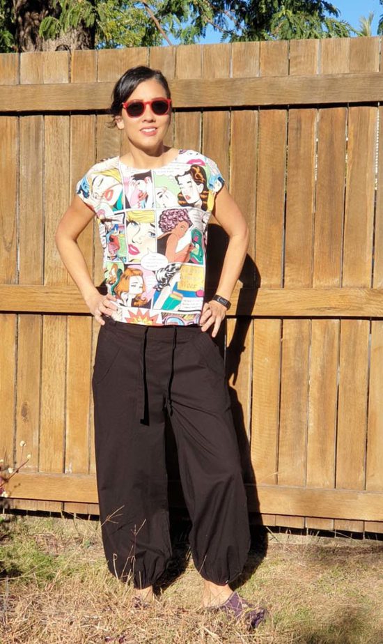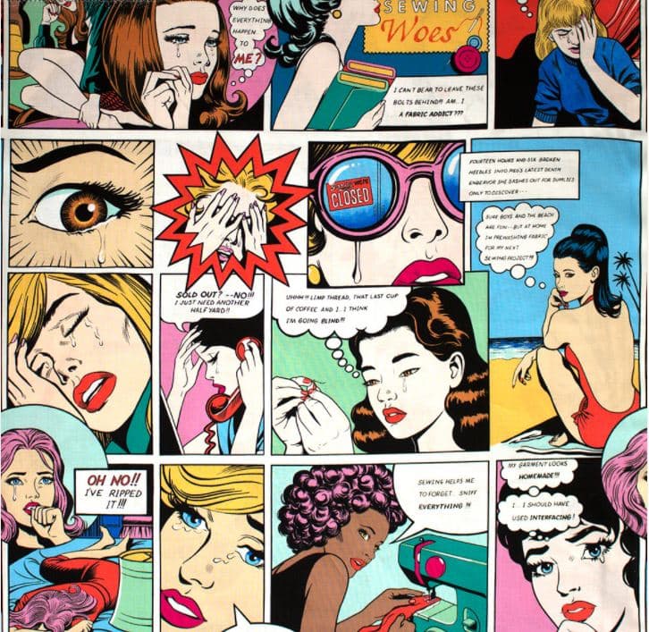The inspiration for this pattern was the ‘sewing woes’ fabric by Alexander Henry, which I got from Voodoo Rabbit. I wanted a boxy top that didn’t have fussiness or shoulder seams like a raglan so that the cartoon was easy to read. Check out a portion of the cartoon….
