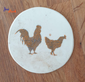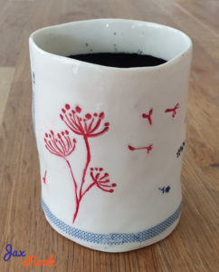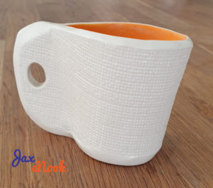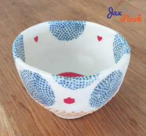 If you know ceramics, then you know that porcelain should not be a starting point for beginners. But ignorance is bliss and I merrily played with this clay while Bub had her day naps. I was using slab and pinch methods to build things, then using my food-grade clay colours to do techniques like mishima and sponging-through-stencils that I’d cut out of contact paper with a stencil knife. I took my items to the kiln at Milton, where some of them cracked during firing because I’d rolled them too thin. In particular, anything I made that tried to mimic thin cardboard always broke. Sometimes the inside of a vessel had ‘crawling’, which is where fine clay dust has settled and bubbled during firing (usually after sanding). You can see this in some of the photos below.