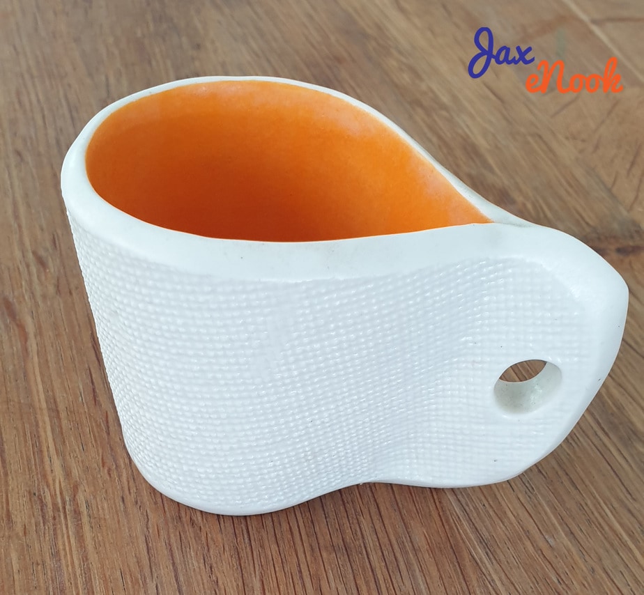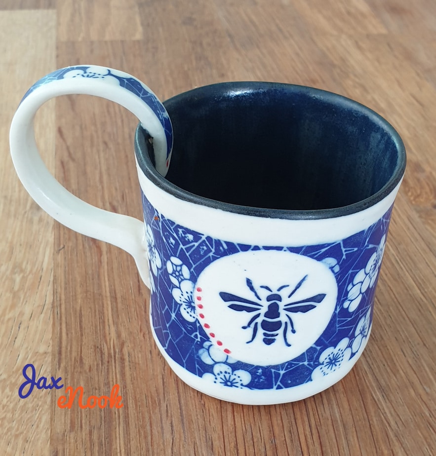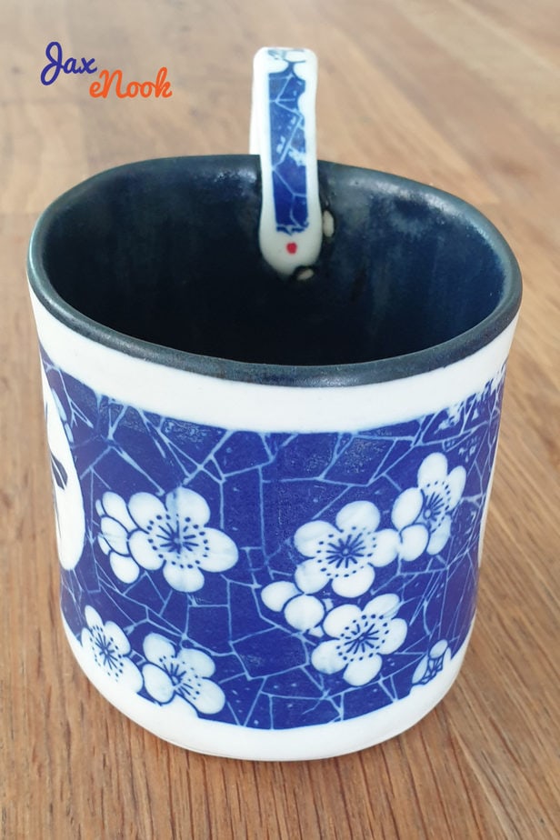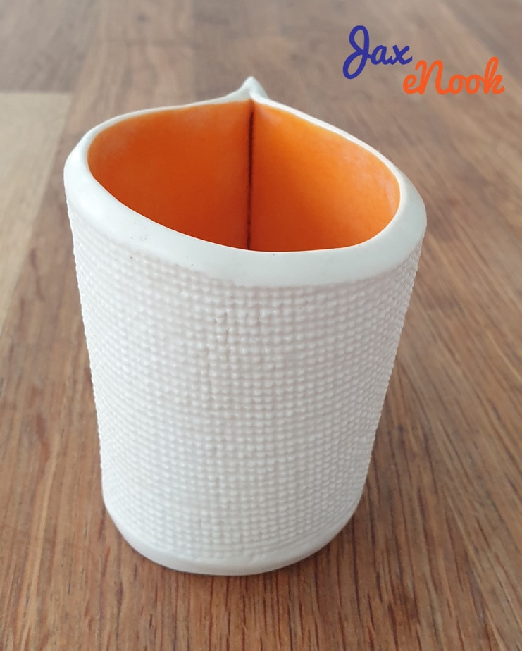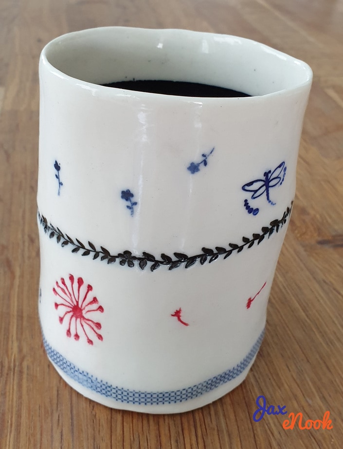 If you know ceramics, then you know that porcelain should not be a starting point for beginners. But ignorance is bliss and I merrily played with this clay while Bub had her day naps. I was using slab and pinch methods to build things, then using my food-grade clay colours to do techniques like mishima and sponging-through-stencils that I’d cut out of contact paper with a stencil knife. I took my items to the kiln at Milton, where some of them cracked during firing because I’d rolled them too thin. In particular, anything I made that tried to mimic thin cardboard always broke. Sometimes the inside of a vessel had ‘crawling’, which is where fine clay dust has settled and bubbled during firing (usually after sanding). You can see this in some of the photos below.