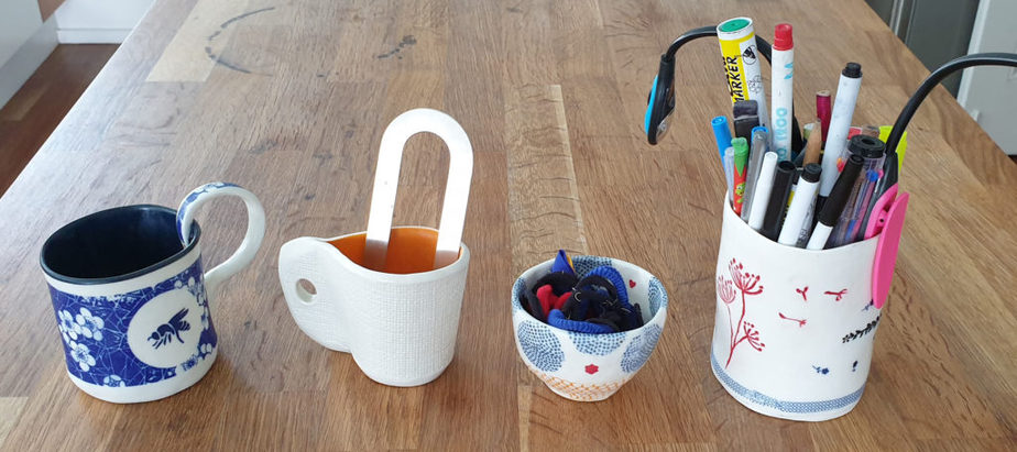 Four years later, I’m still happy with that short stint of creativity. I didn’t keep up the hobby, mainly because clay is very time-specific. There is a magic window between wet and dry, when the clay is malleable yet strong – and on many occasions, this just didn’t work with Bub waking up. Plus it’s messy, so you need a dedicated space that you’re happy to get clay-slop and paint on. I did return to it once (an external space) to make a large slab bowl. I gave that to my parents and will add the photo below when I get round to it. Here are some of the other items….